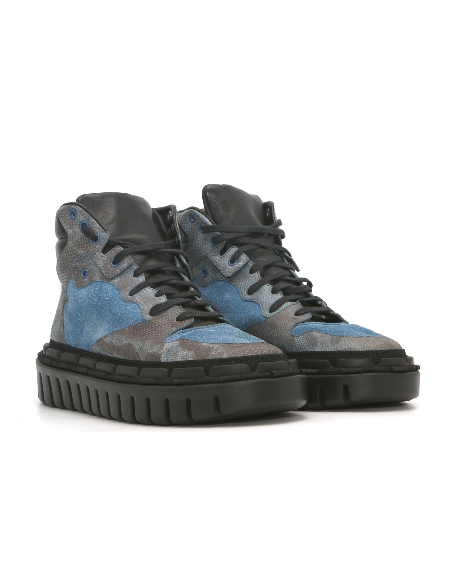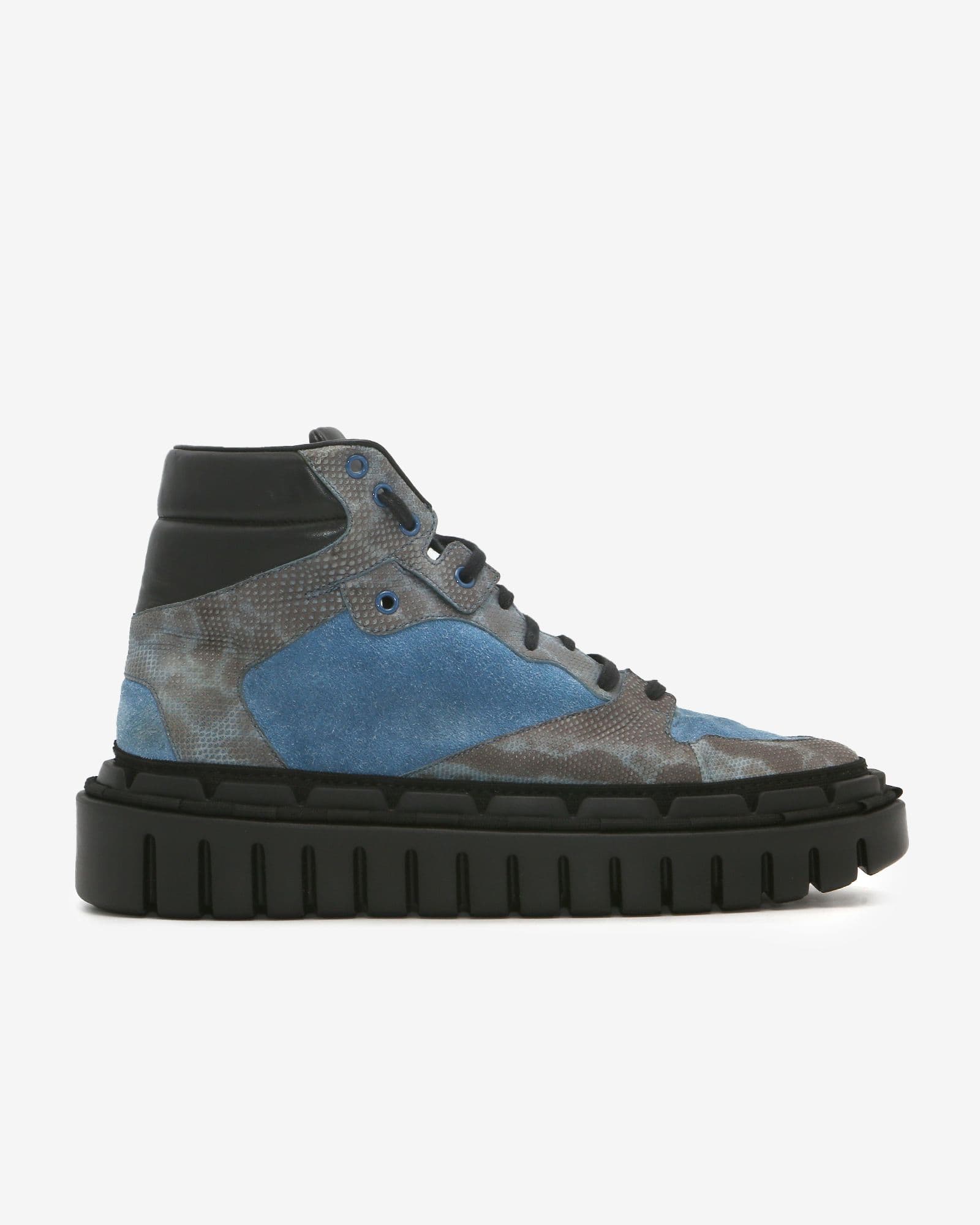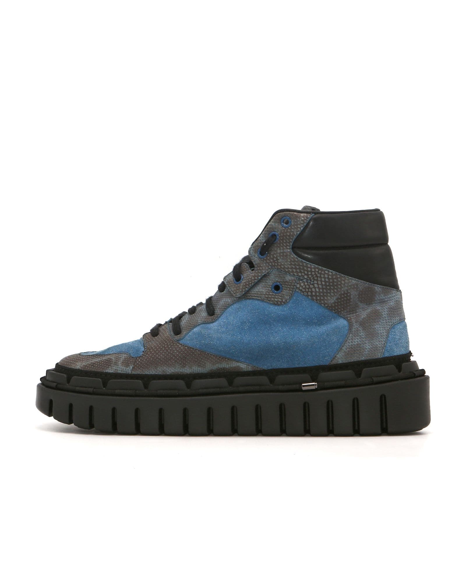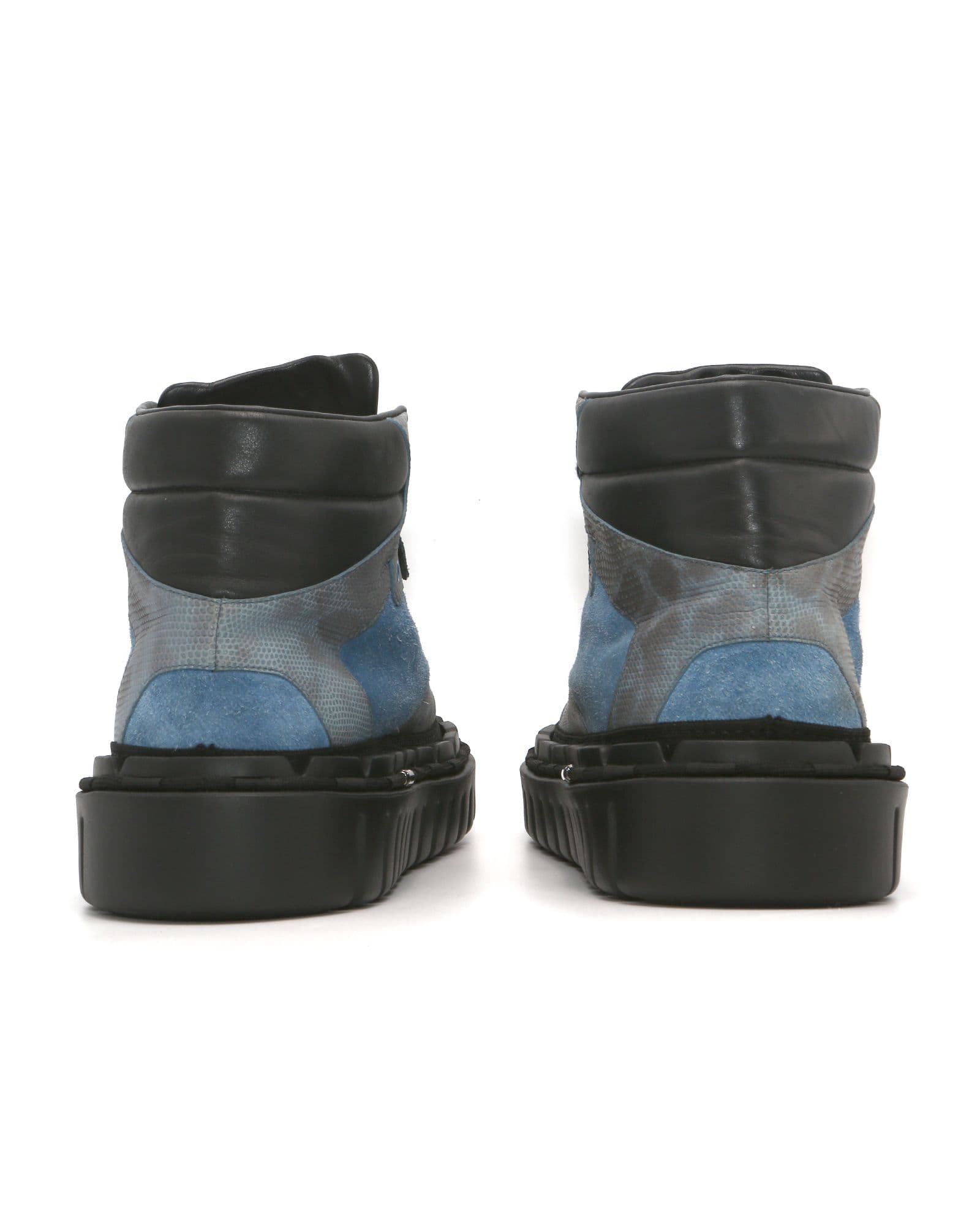 TRAINER BLUE MULTI KHOLAB 1/1 Handcrafted KHOLAB Size: 11 · Grey Reptile Leather · Split Suede · Calf Skin lining · Signature KHOLA Sole (Black) · Signature KHOLA Cord (Black) Color: Black/Blue Upper: Full Grain Leather/Split Suede/Reptile Leather Sole: EVA Assembled in Los Angeles Upper condition: 9/10