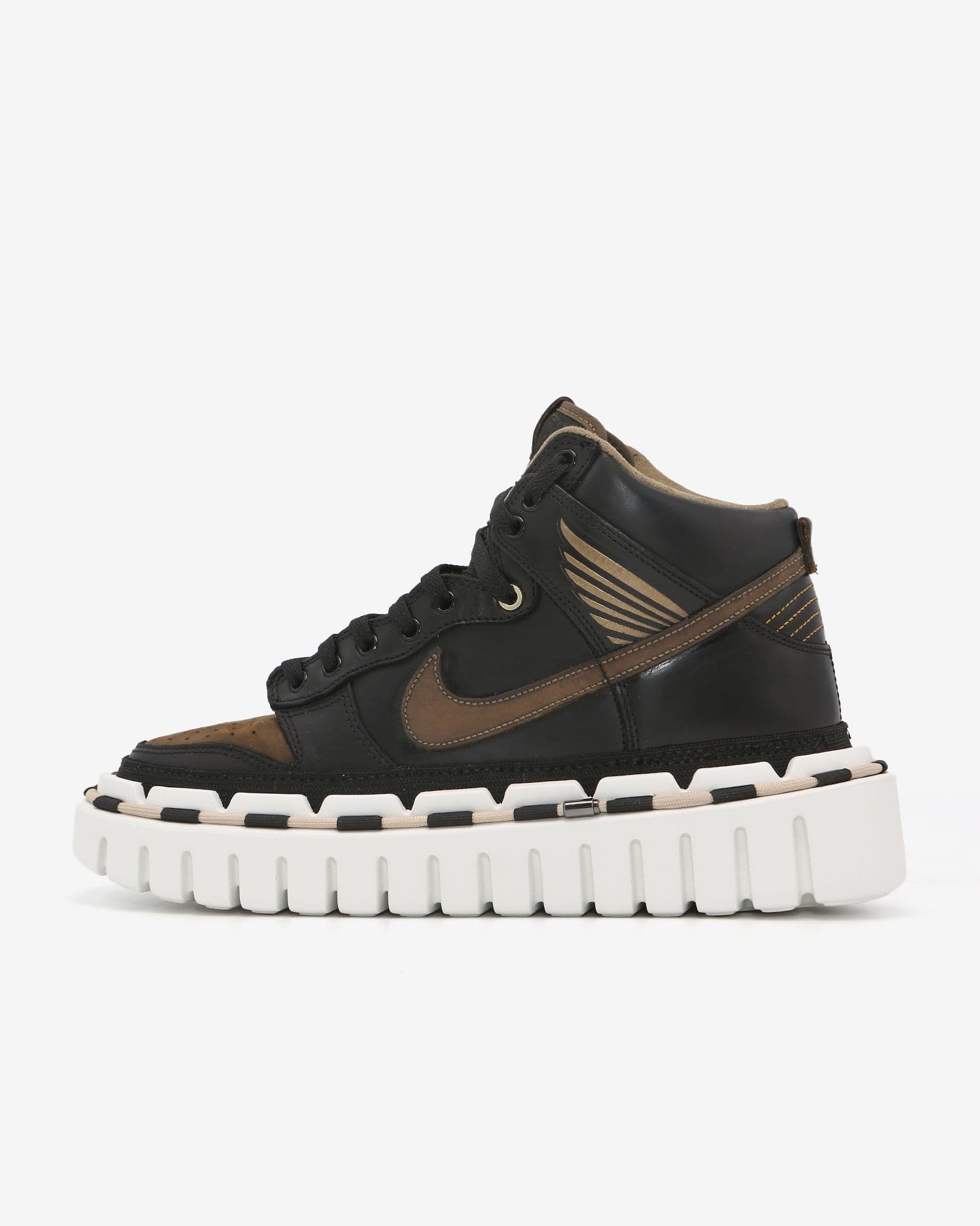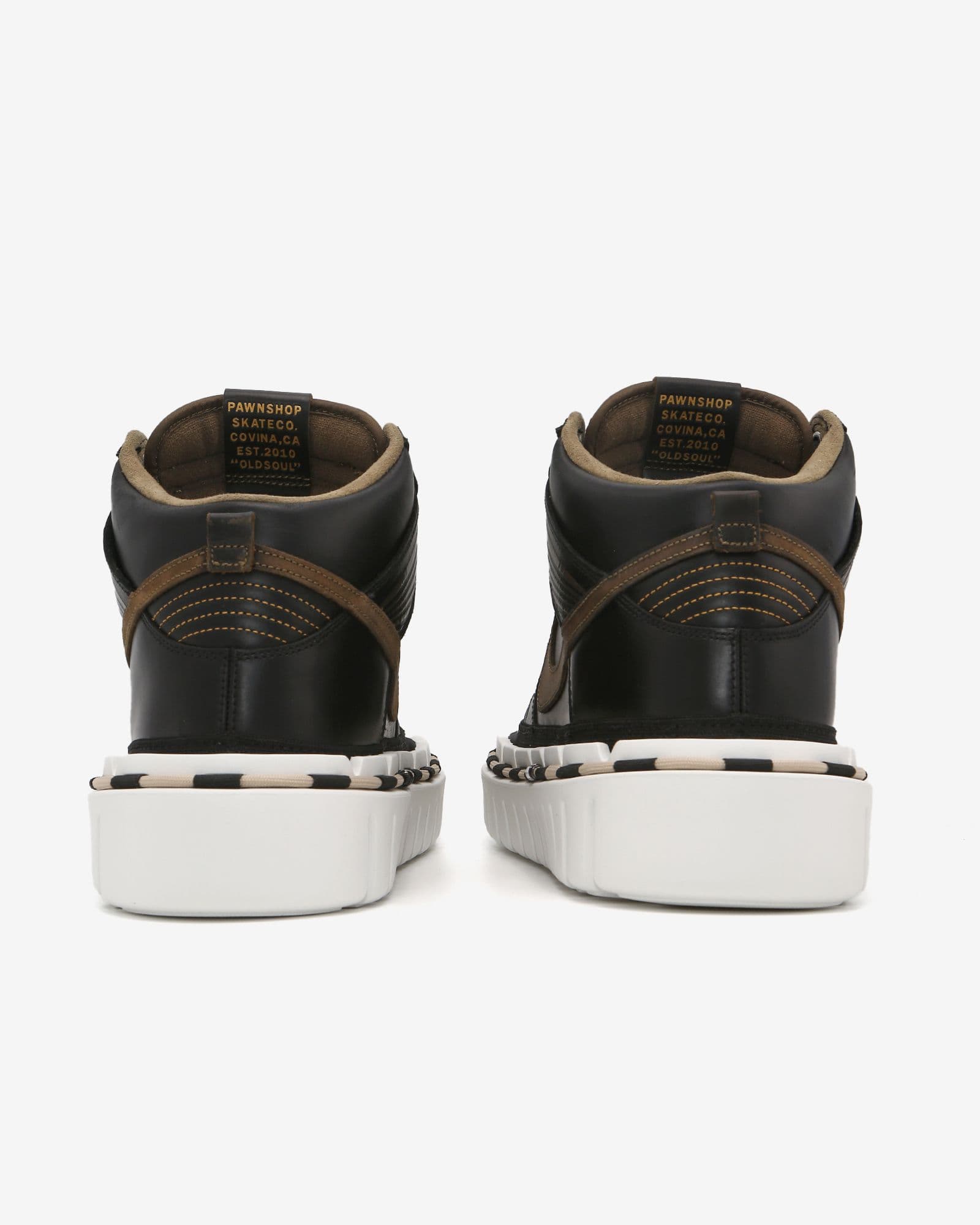 DUNK "PAWNSHOP" KHOLAB 1/1 Handcrafted KHOLAB Size: 10 · Split Suede Upper · Leather Overlay panels · Branded Detailing · Signature KHOLA Sole (White) · Signature KHOLA Cord (Tan) Color: Black/Brown/White Upper: Split Suede Sole: EVA Assembled in Los Angeles