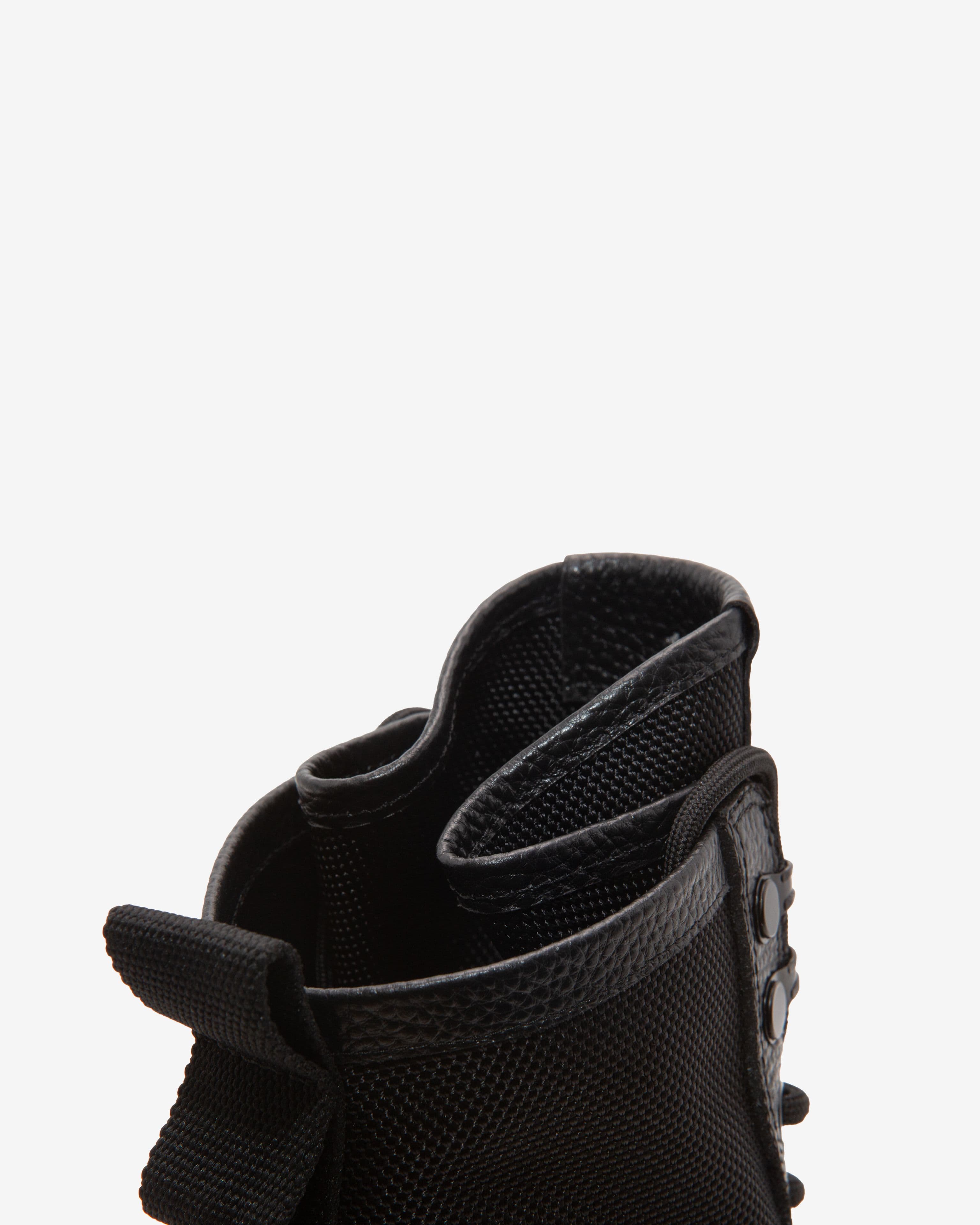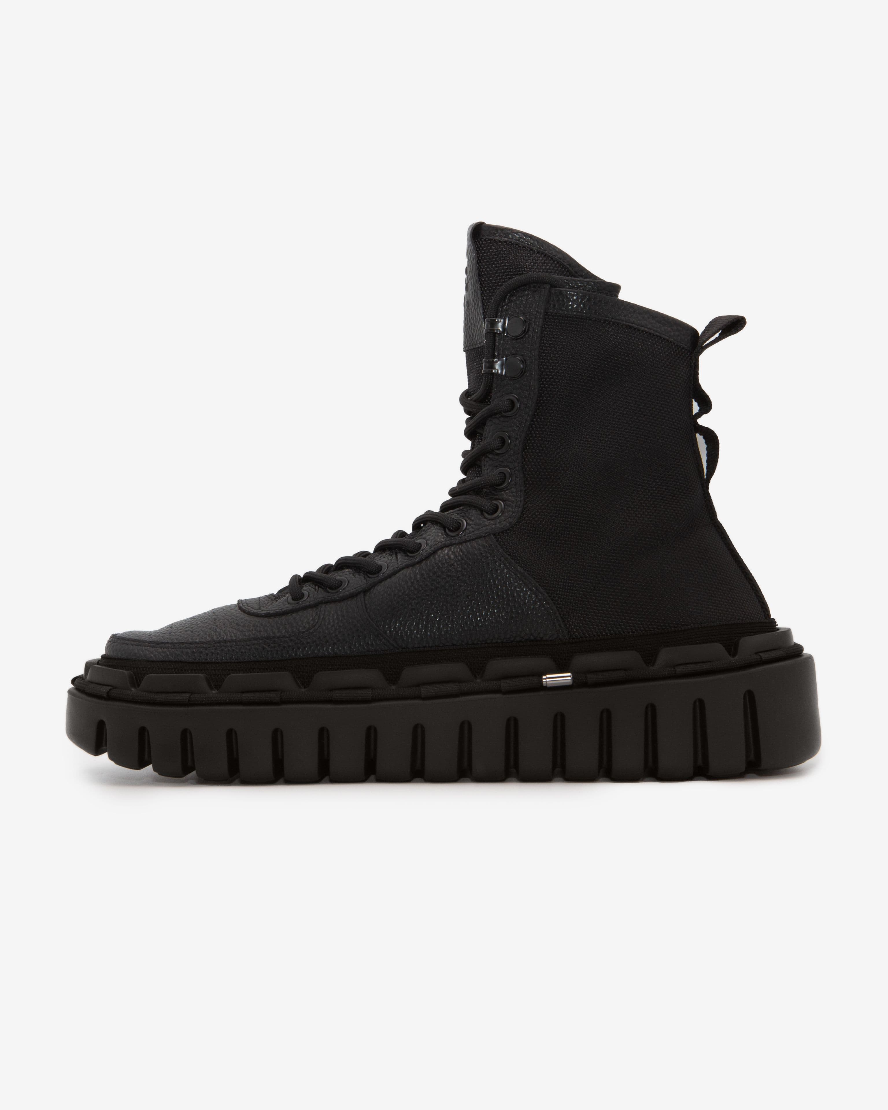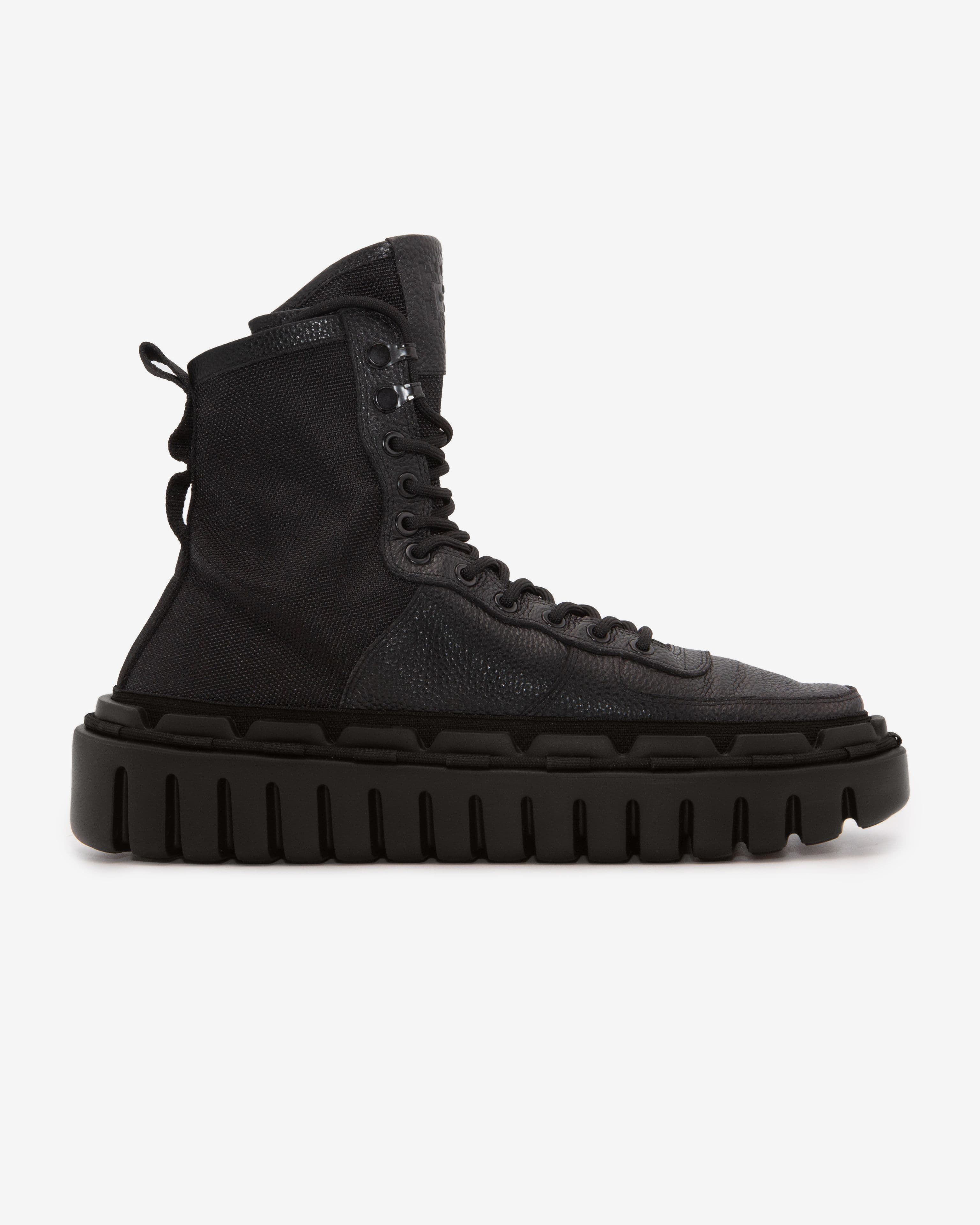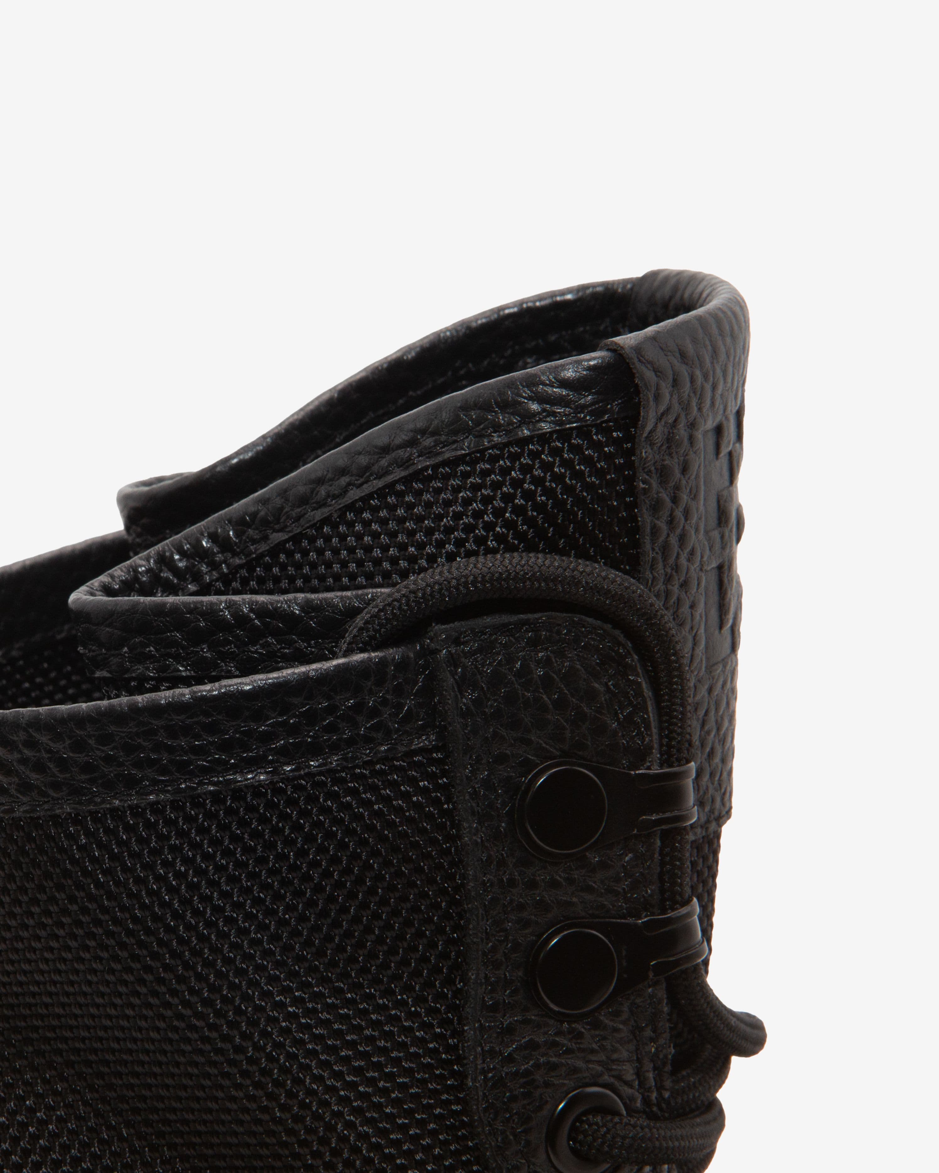 KHOLA EXTERIOR BOOT BLACK 1.0 1/152 Handcrafted KHOLAB · Genuine Leather Upper · Cotton Nylon Paneling · Gun Metal Hardware · Heavy Duty Heel Pull · Cotton Nylon Rope Laces · Signature KHOLA Sole (Black) · Signature KHOLA Cord (Black) Color: Obsidian Black Upper: Leather/Nylon Sole: EVA Assembled in Los Angeles