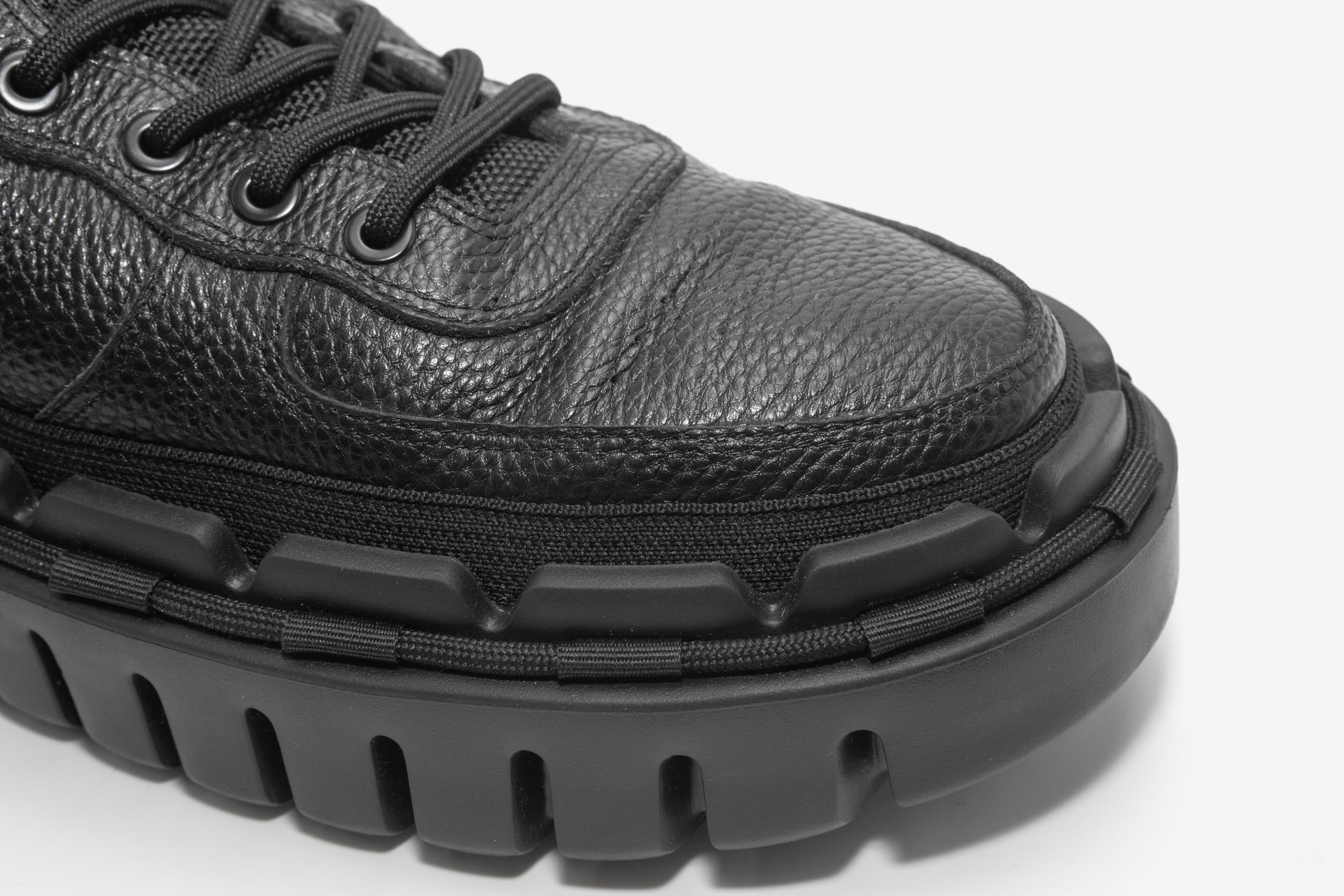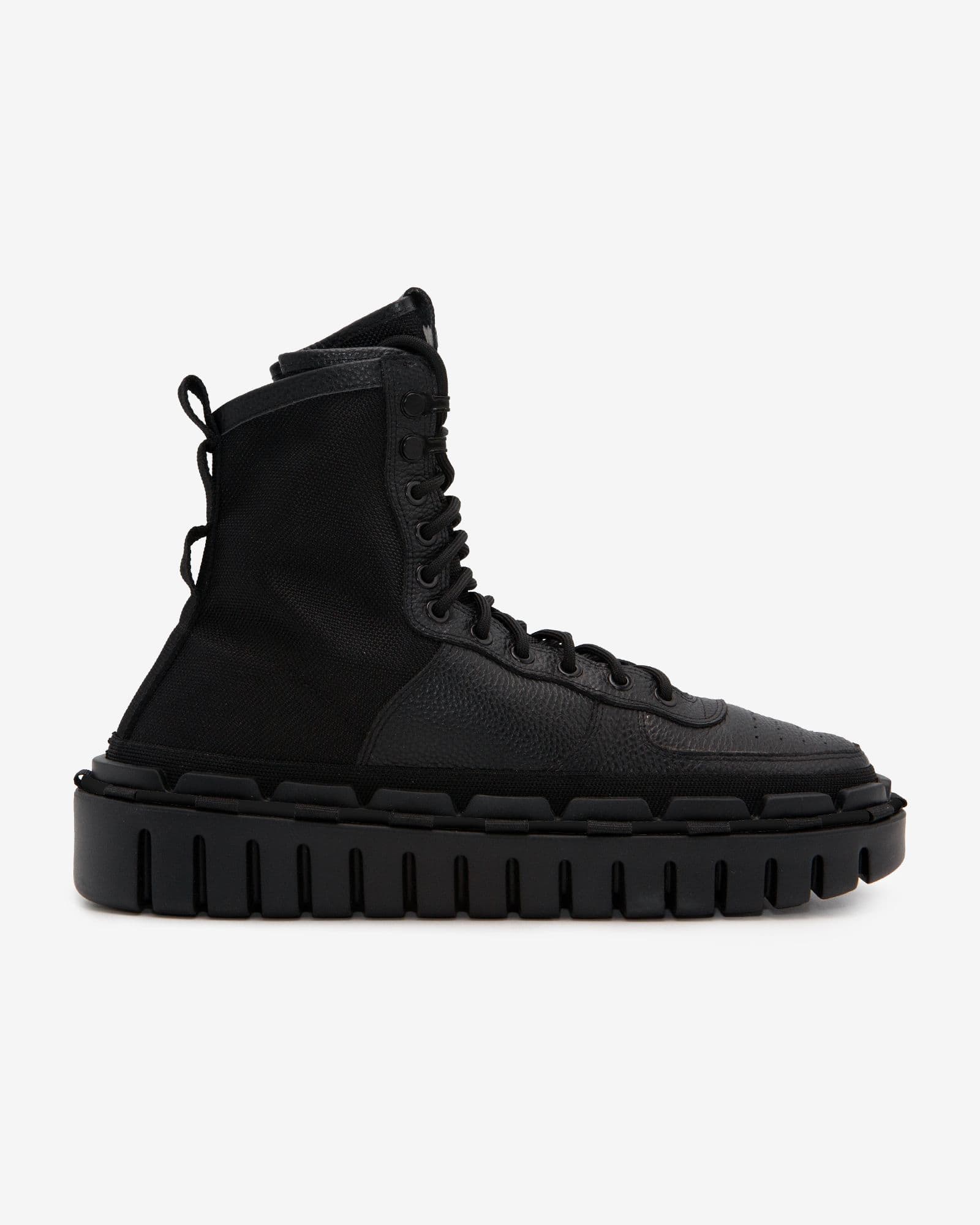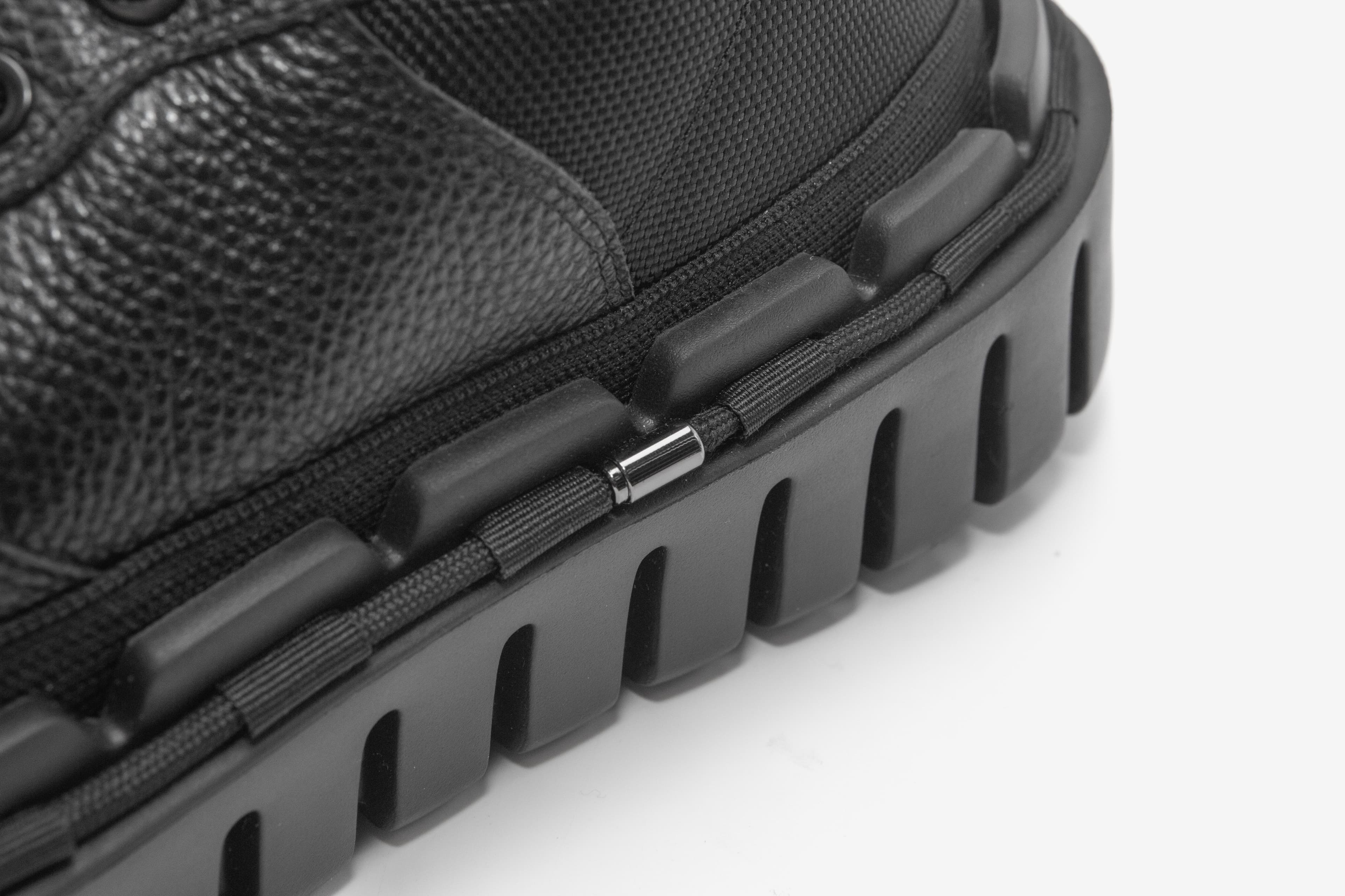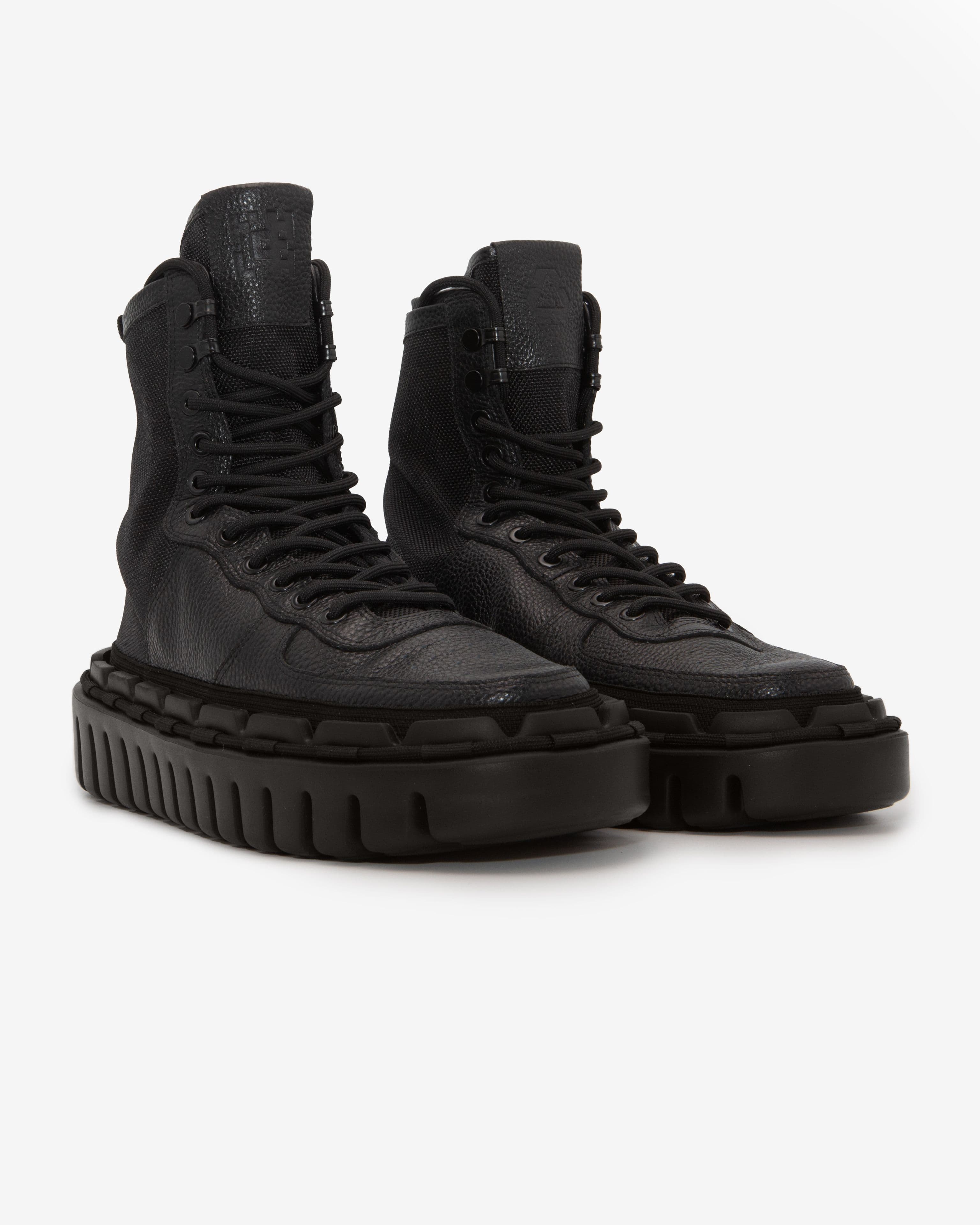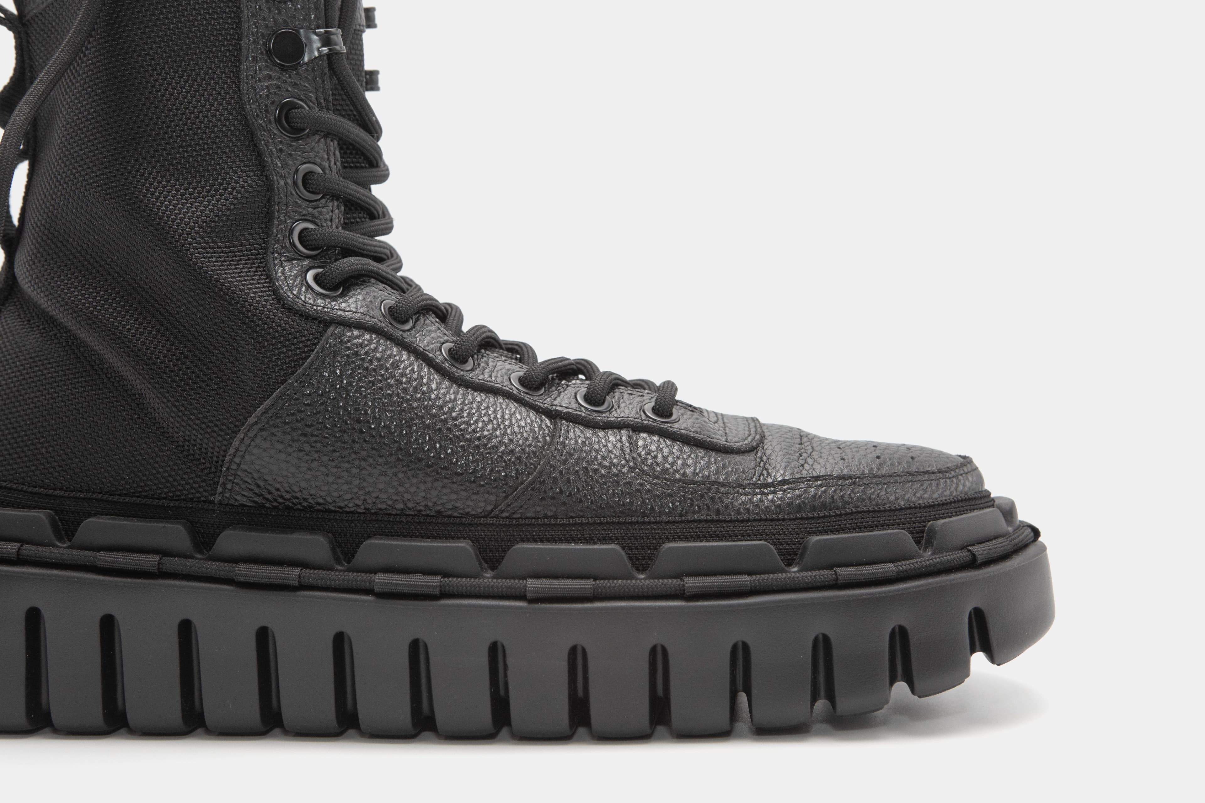 KHOLA EXTERIOR BOOT BLACK 1.0 1/152 Handcrafted KHOLAB · Genuine Leather Upper · Cotton Nylon Paneling · Gun Metal Hardware · Heavy Duty Heel Pull · Cotton Nylon Rope Laces · Signature KHOLA Sole (Black) · Signature KHOLA Cord (Black) Color: Obsidian Black Upper: Leather/Nylon Sole: EVA Assembled in Los Angeles