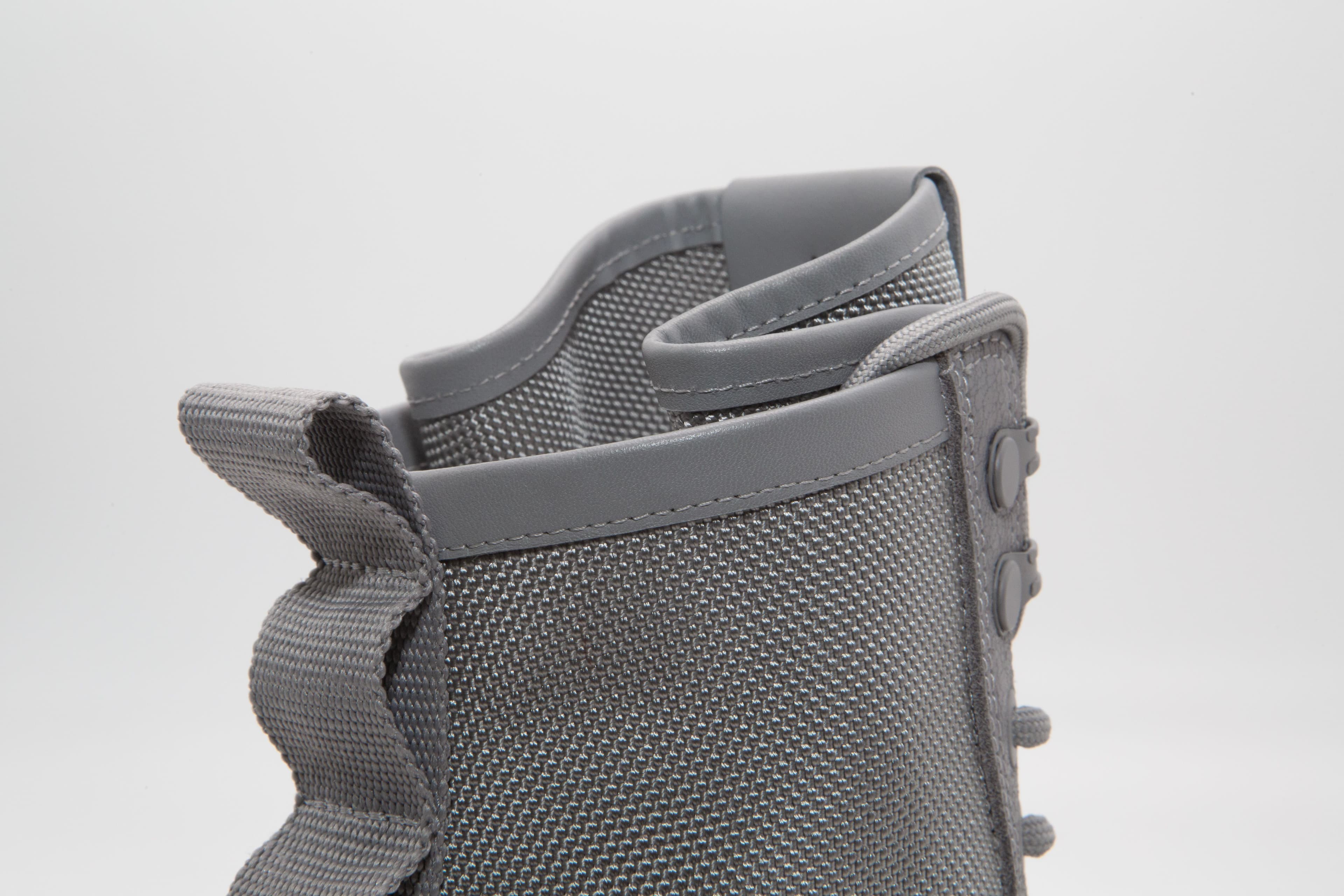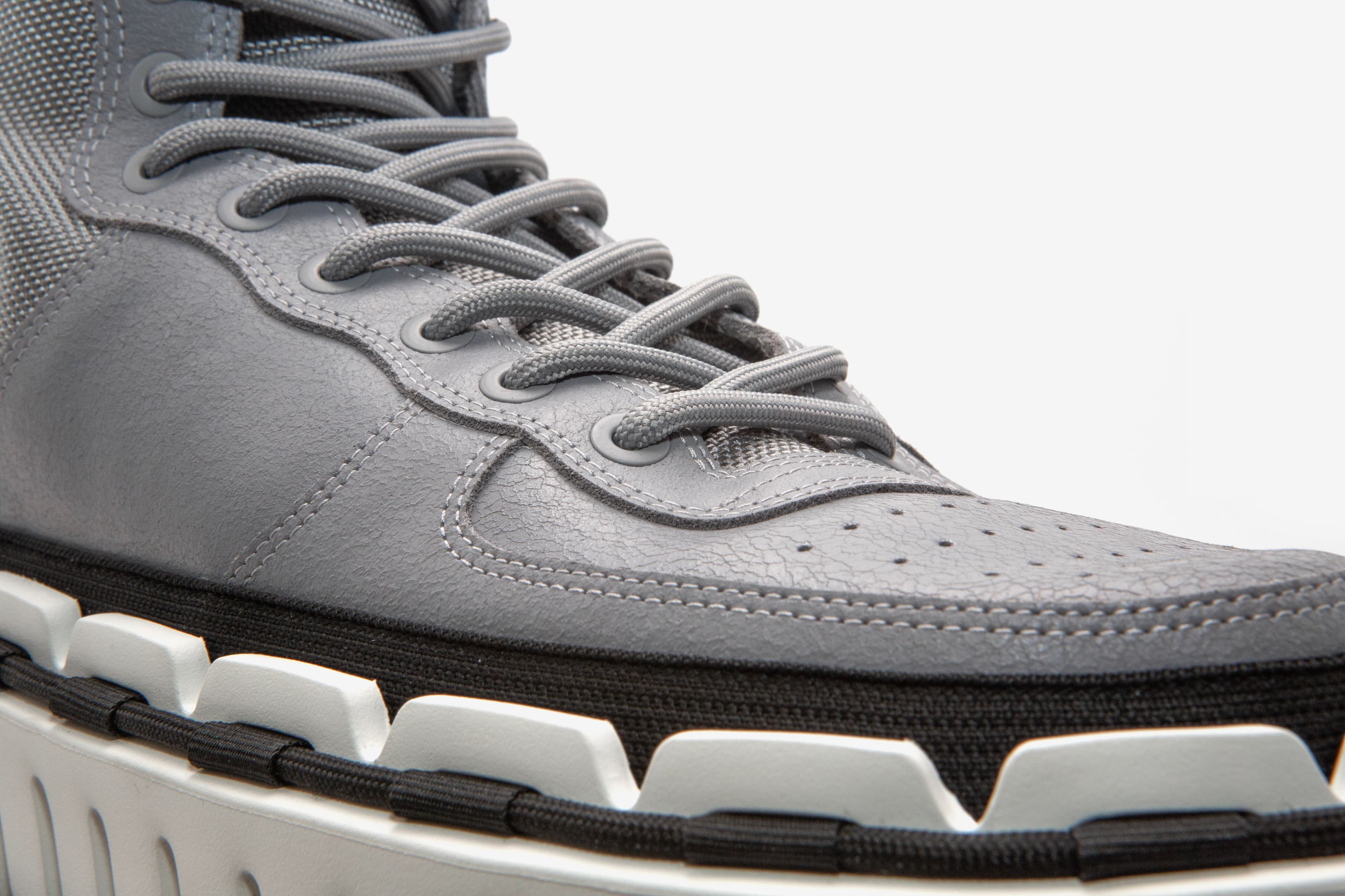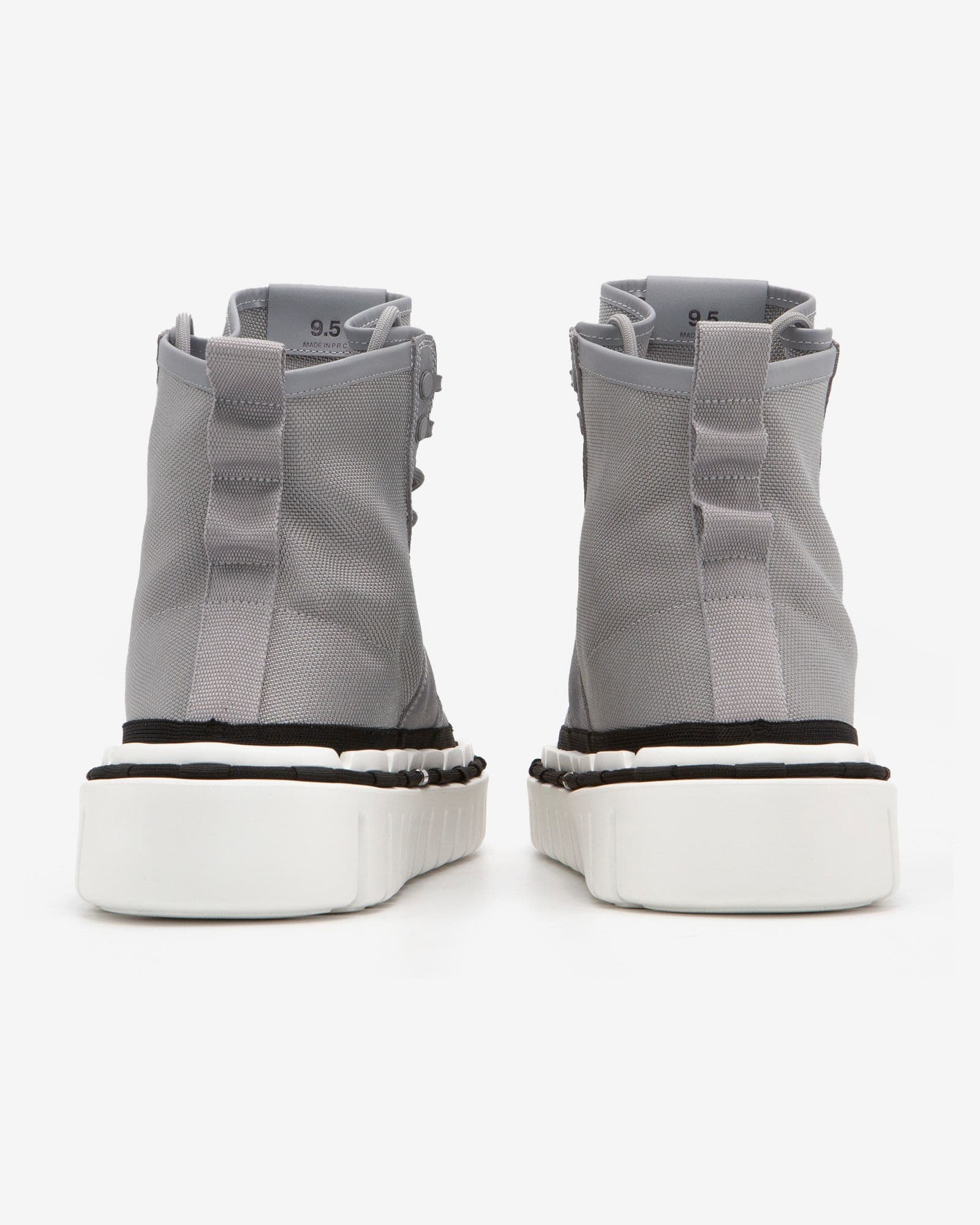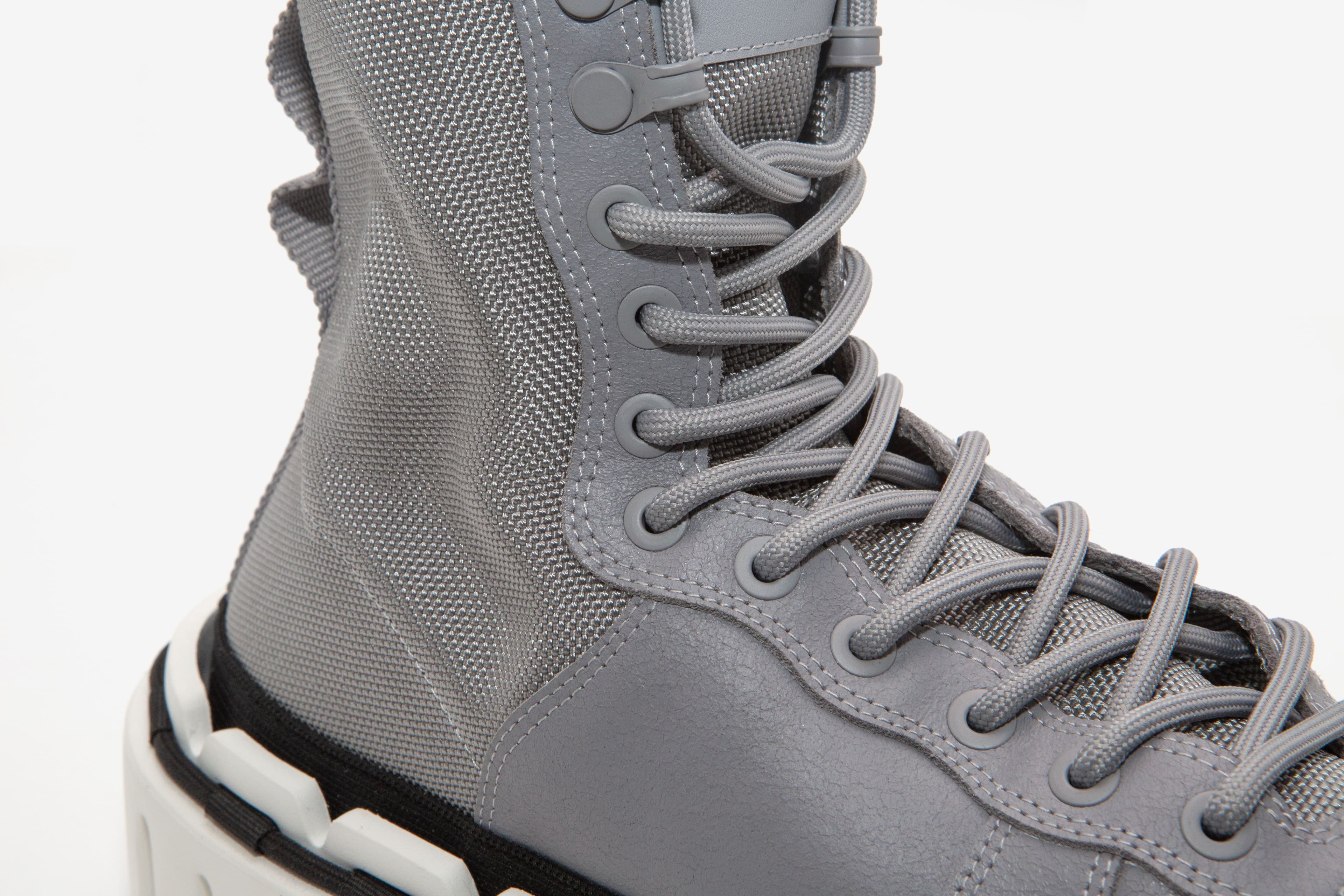 KHOLA EXTERIOR BOOT ALLOY GREY 1/76 Handcrafted KHOLAB · Genuine Crackled Leather Upper · Cotton Nylon Paneling · Gun Metal Hardware · Heavy Duty Heel Pull · Cotton Nylon Rope Laces · Signature KHOLA Sole (White) · Signature KHOLA Cord (Black) Color: Alloy Grey Upper: Crackled Leather + Nylon / Sole: EVA Assembled in Los Angeles